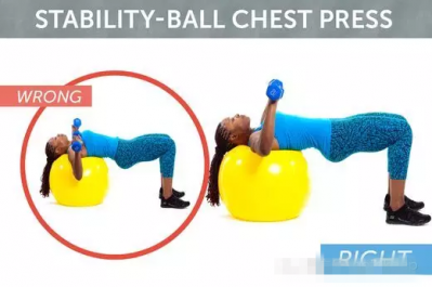 健身房里使用瑜伽球進行相關訓練時,一定要確保瑜伽球的穩(wěn)定,避免因為晃動受傷。在瑜伽球上進行啞鈴臥推時,手肘到下端時,要成90度直角。