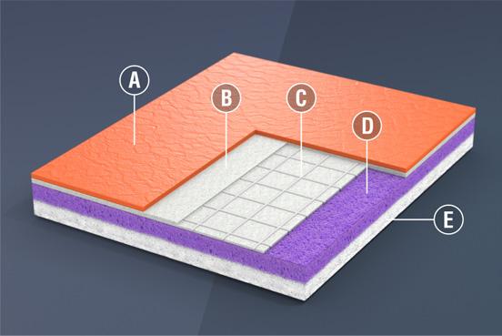 高密度抗壓強度層和增強纖維發泡層結合保證了Vinylsport的尺寸穩定性和持久的表面穩定性。